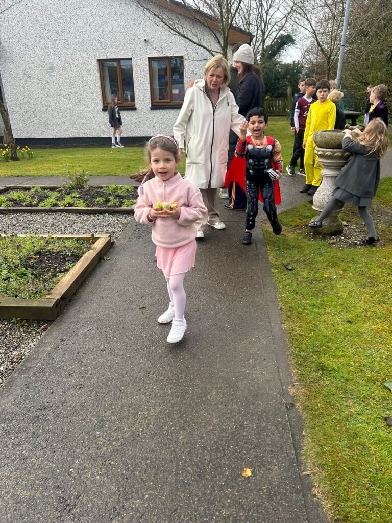 There were plenty of activities taking place throughout the week. Mr. Collier’s 5th and 6th class organised a fun Easter egg hunt for the Junior and Senior Infants, which was enjoyed by all. Meanwhile, Ms. Murray’s 4th class and Ms. Broe’s Senior Infants spent time together in the hall, reading and sharing books, creating a lovely atmosphere of collaboration and learning.